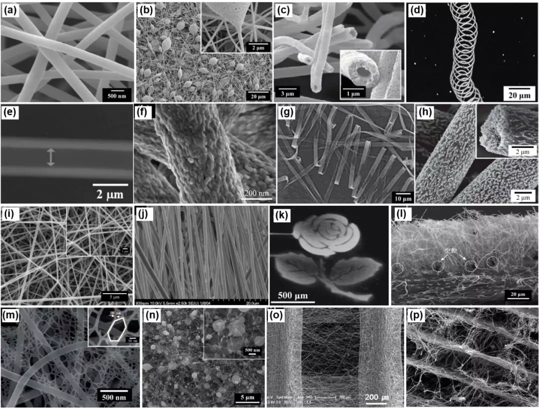 图3静电纺纤维材料结构:(a-h)单纤维结构;(i-p)纤维集合体结构