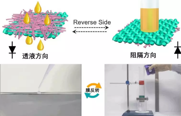 图2.水滴在Janus复合膜从疏液向亲液方向透过。