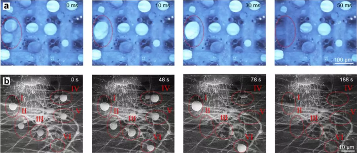 图5. 雾滴在亲/疏异质复合膜表面的捕获--长大--合并--传输和收集过程的光学及环境扫描电镜(ESEM)图。