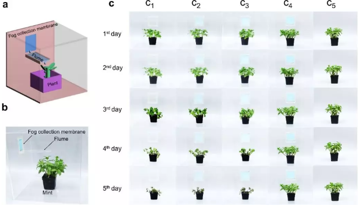 图6. (a, b) 模拟温室用于雾气收集和植物(薄荷)灌溉的示意图和实物图。(c) 不同环境下的对照试验:(c1-c3) 无水灌溉的对照组;c4)亲/疏异质复合集雾膜;(c5) 正常灌溉组。可以看出对照组植物干枯,而集雾膜植物和正常灌溉植物一样长势良好