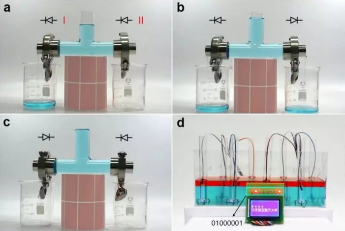 该工作不但实现了高液压比液体单向透过,而且适用于从极性到非极性的不同表面张力液体体系。这种Jauns复合膜的单向透过性质可以实现液体的可控方向性透过(图4a-c),利用Janus复合膜液体“二极管”特性和极性液体的导电性,还可设计水单向透过触发的“1”和“0”电信号接收装置。